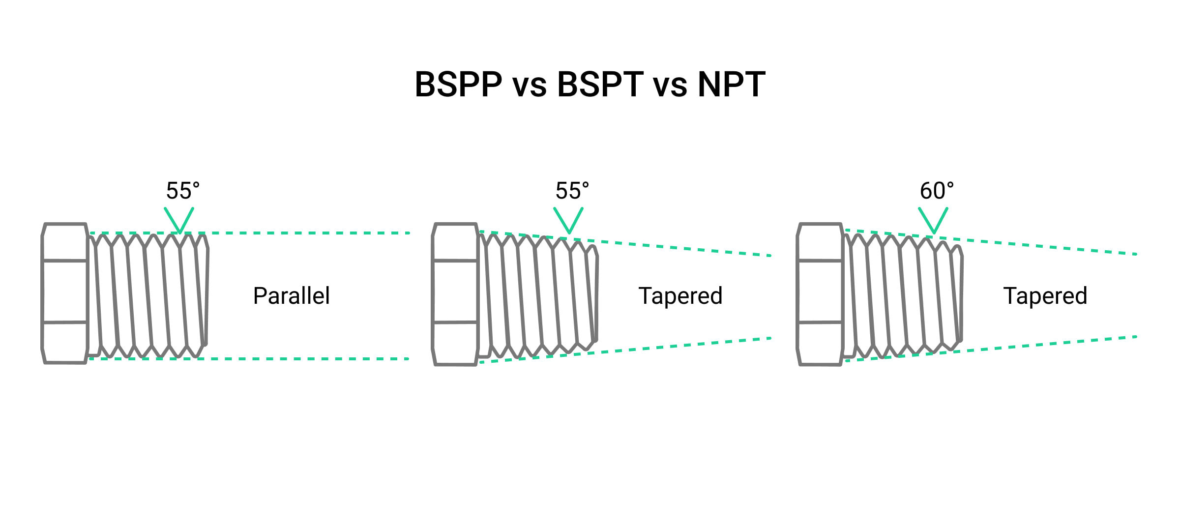 Accanto al BSPP parallelo con profilo Whitworth a 55°, esistono infatti anche varianti di derivazione americana, come il NPS, caratterizzato da un profilo a 60°, pur mantenendo una geometria parallela.